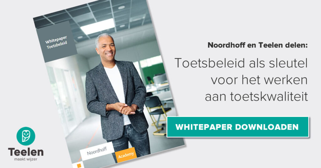 Veel onderwijsinstellingen zoeken naar manieren om te komen tot helder geformuleerd toetsbeleid, dat samenhangt met de eigen onderwijskundige visie. Dat is niet altijd eenvoudig, maar wel erg belangrijk. Want een goed doordachte visie op toetsing draagt bij aan het realiseren van de doelen die jouw school voor ogen heeft. Met de whitepaper “Toetsbeleid” helpen we je graag op weg. Na het lezen meer advies of ondersteuning nodig? Dan staan we natuurlijk ook graag voor je klaar.