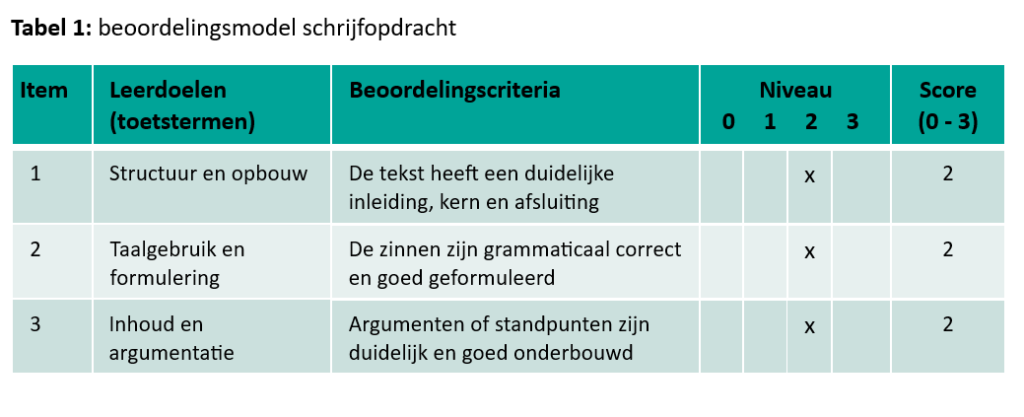 Om een praktijkopdracht te beoordelen heb je allereerst een beoordelingsmodel nodig. Het beoordelingsmodel bestaat uit beoordelingscriteria – die gestoeld zijn op de leerdoelen (toetstermen) – en per beoordelingscriterium is er een niveaubeschrijving. Hieronder zie je een voorbeeld van een beoordelingsmodel voor een schrijfopdracht (tabel 1).