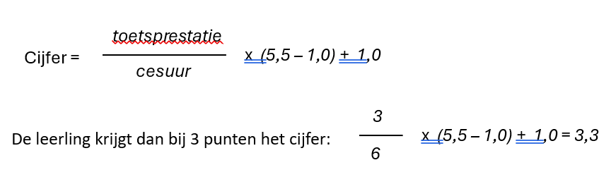 Stel dat een leerling 5 van de 9 punten behaalt. Dan is de toetsprestatie ongeveer 55% (5 ÷ 9 × 100%), wat in deze berekening resulteert in een cijfer van 5,5. De cesuur ligt bij deze formule dus op 55%.
