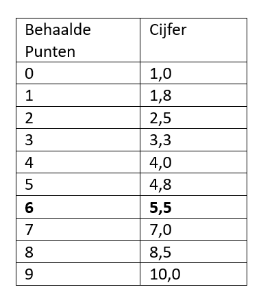 Op basis van deze 2 formules kun je met behulp van Excel (of met een rekenmachine) een omzettingstabel maken van het aantal behaalde punten en het corresponderende cijfer voor de praktijkopdracht.