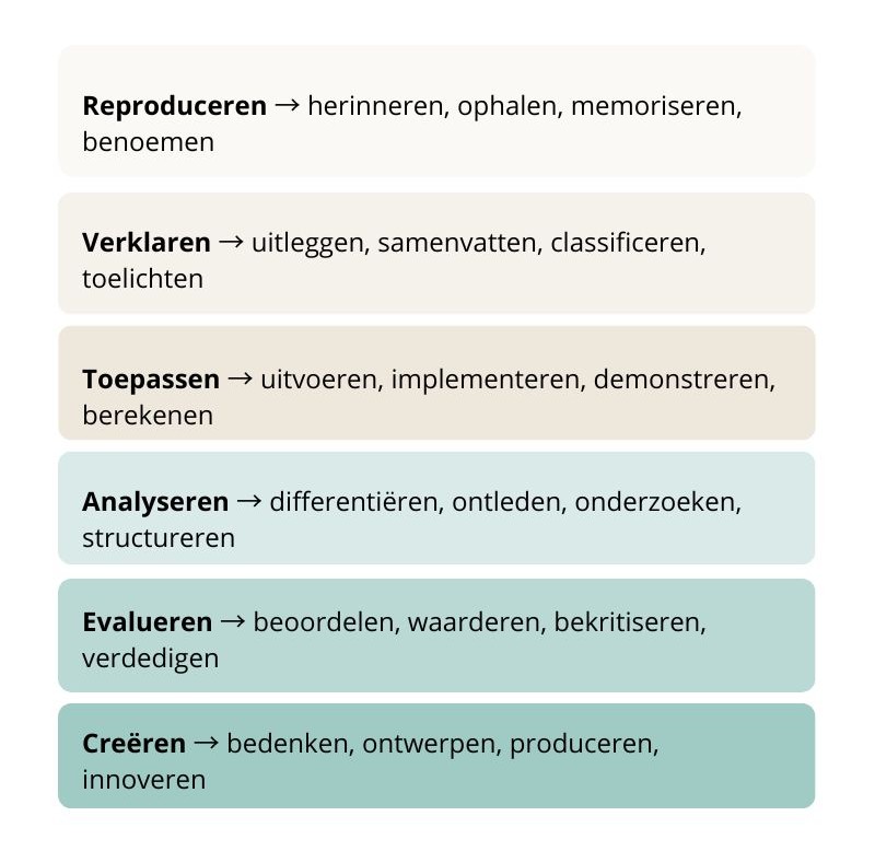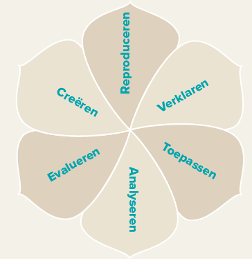 - Reproduceren: Het letterlijk kunnen weergeven van informatie (in plaats van ‘onthouden’, omdat dit beter meetbaar is).